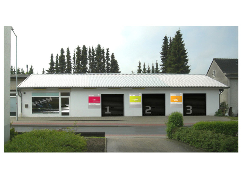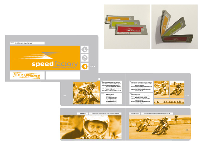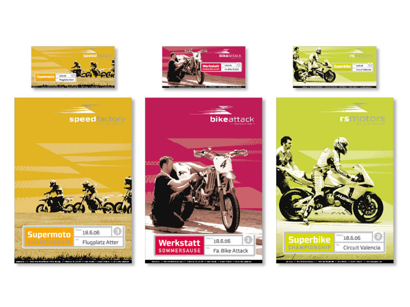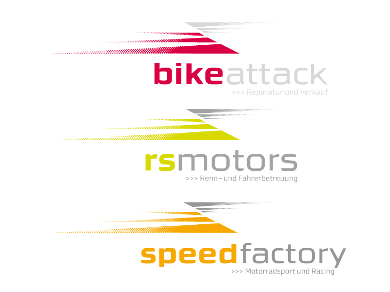 Hier entstand ein Gemeinschaftslogo für 3 Firmen unter einem Dach aus dem Bereich Motorradrennsport – Fahrerbetreuung, Werkstatt und eigener Rennstall. Das Logo stilisiert Reifenspuren hin zu einem "S", Intitial der Firmeninhaber Brüder Schmidt. Das Logo teilt sich weiter in zwei Bereiche (stellvertretend für die beiden Firmeninhaber), welche sich wiederum dreiteilen, was die 3 Firmen unter einem Dach symbolisiert. Das darum entstandene Corporate Design greift grafische Elemente aus dem Motorsport auf, beispielsweise wird mit Aufklebern gearbeitet, die den Briefbogen der jeweiligen Firma erst individualisieren. Ebenso gibt es Blanko-Plakate, welche durch Aufkleber aktuell werden.
