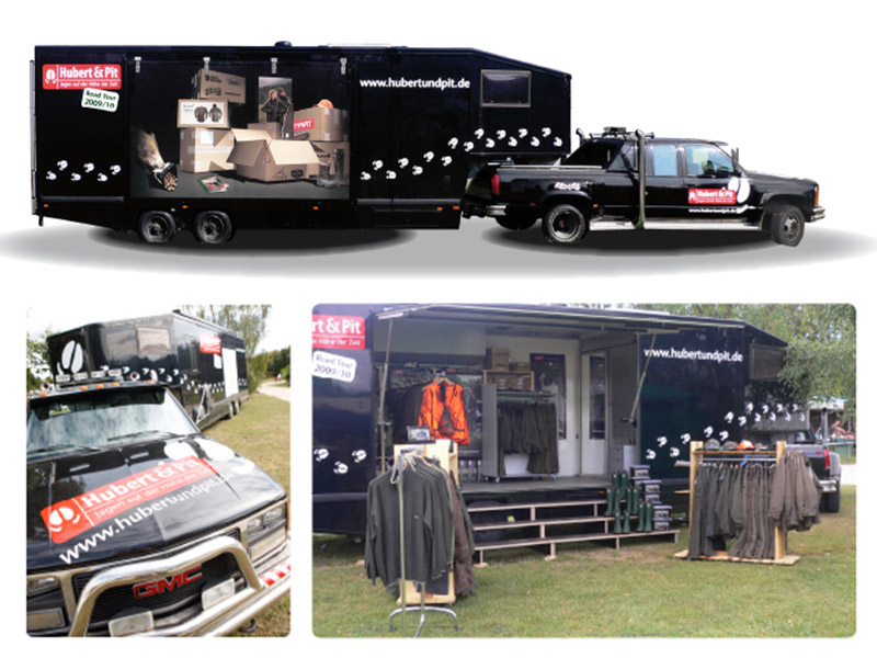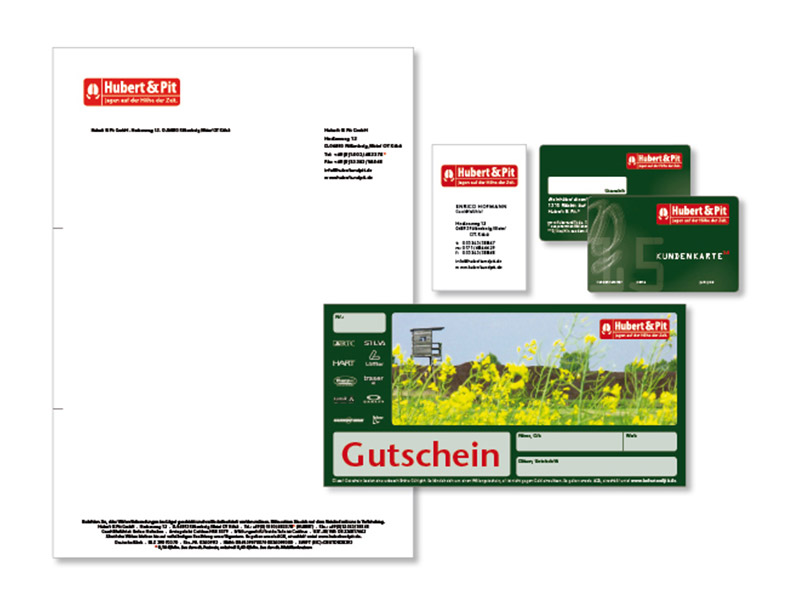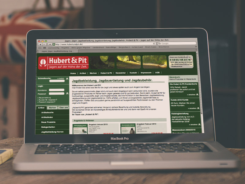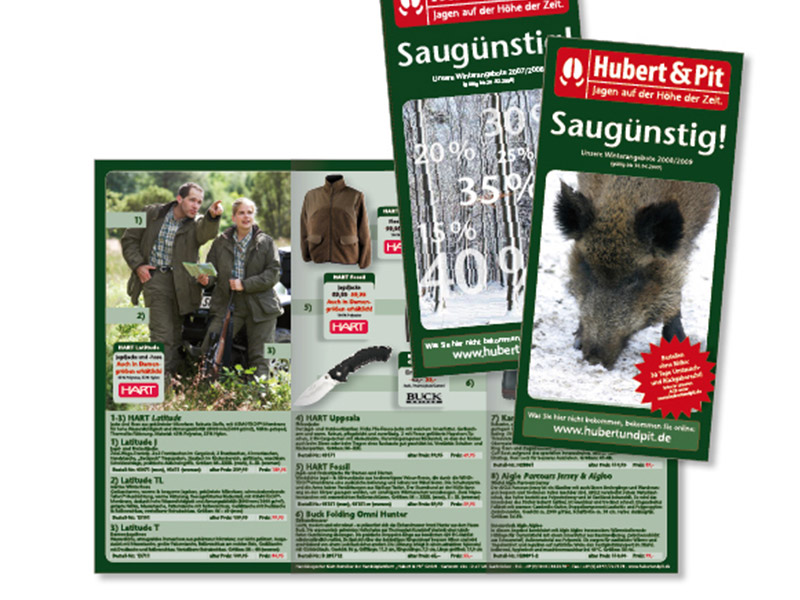 Hubert & Pit bietet im Onlineshop Jagdbekleidung von A-Z. Das Corporate Design hierzu entwickelte ich von Anfang an, vom Logo, über Geschäftspapiere, Drucksachen wie Flyer und Kataloge, über den Onlineshop und den Messestand bis hin zur Fahrzeugbeschriftung z.B. eines Messetrucks.