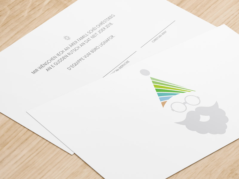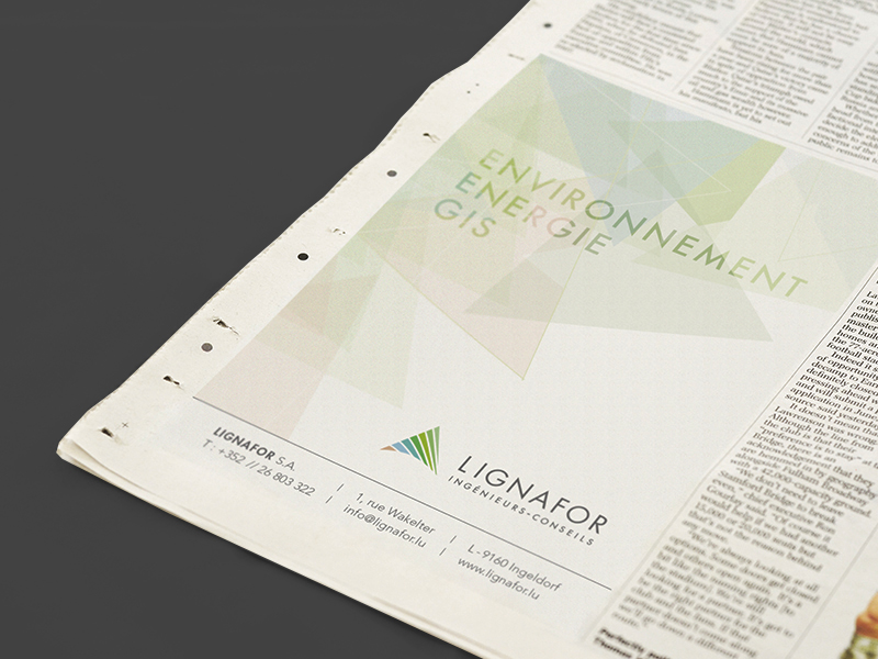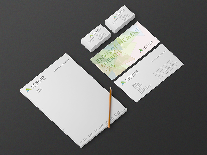 Das dreieckige Logo mit seinen drei Farbbereichen steht stellvertretend für die drei Hauptdienstleistungen: Environnement, Energie und GIS. Dieses Logo visualisiert mit farnhafter Auffächerung verstärkt die Vielfalt, Eigenart und Schönheit von Natur und Landschaft in abstrakter, moderner und prägnanter Darstellungsweise. Nach der Logoentwicklung folgte das gesamte Corporate Design.