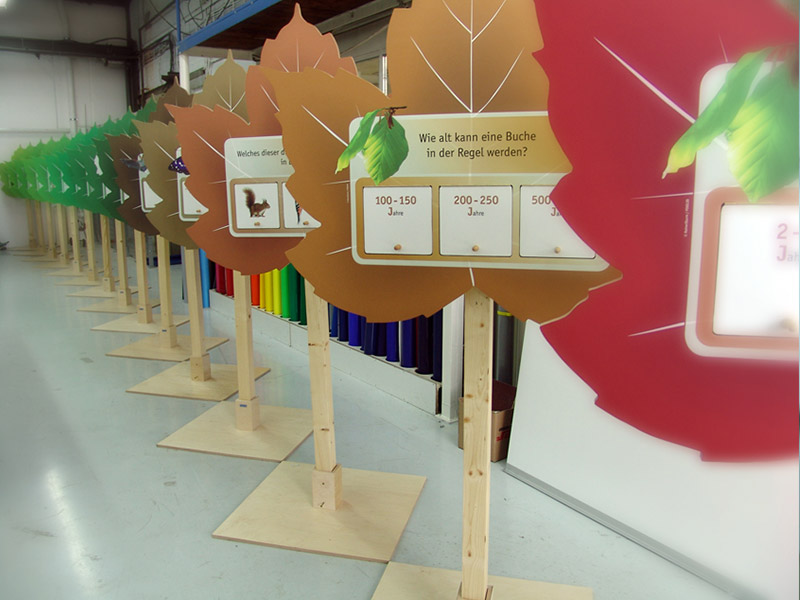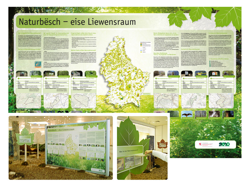 Das Forstamt Luxemburg hat diese mobile Ausstellung in Auftrag gegeben, bei der es darum ging, spielerisch die luxemburger Natur zu erkunden. Insgesamt entstanden 20 Blatttafeln aus Holz mit Klappenquiz und ein Informationsbanner – vom ersten Layout bis zum fertigen Produkt.